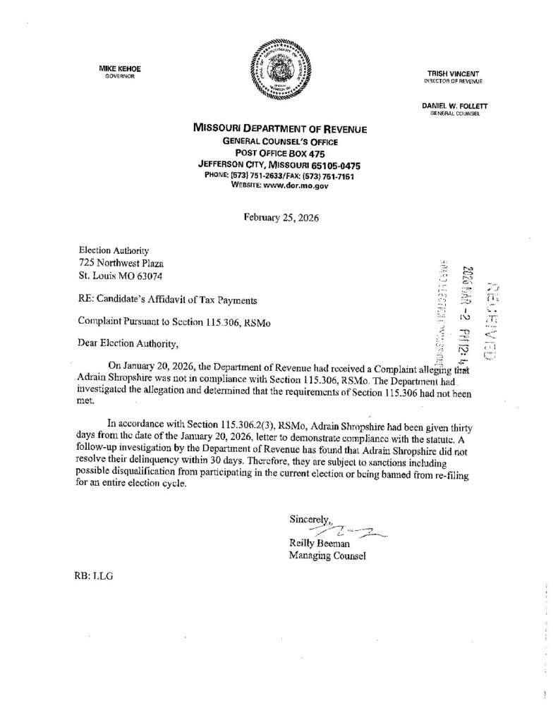 Fey also provided a copy of the letter the Board received from the General Counsel’s Office of the Missouri Department of Revenue. According to the letter, a complaint had been received in January that Shropshire was not in compliance with the state code requiring that candidates filing to run for office cannot be “delinquent in the payment of any state income taxes, personal property taxes, municipal taxes, real property taxes on the place of residence, as stated on the declaration of candidacy, or if the person is a past or present corporate officer of any fee office that owes any taxes to the state.”