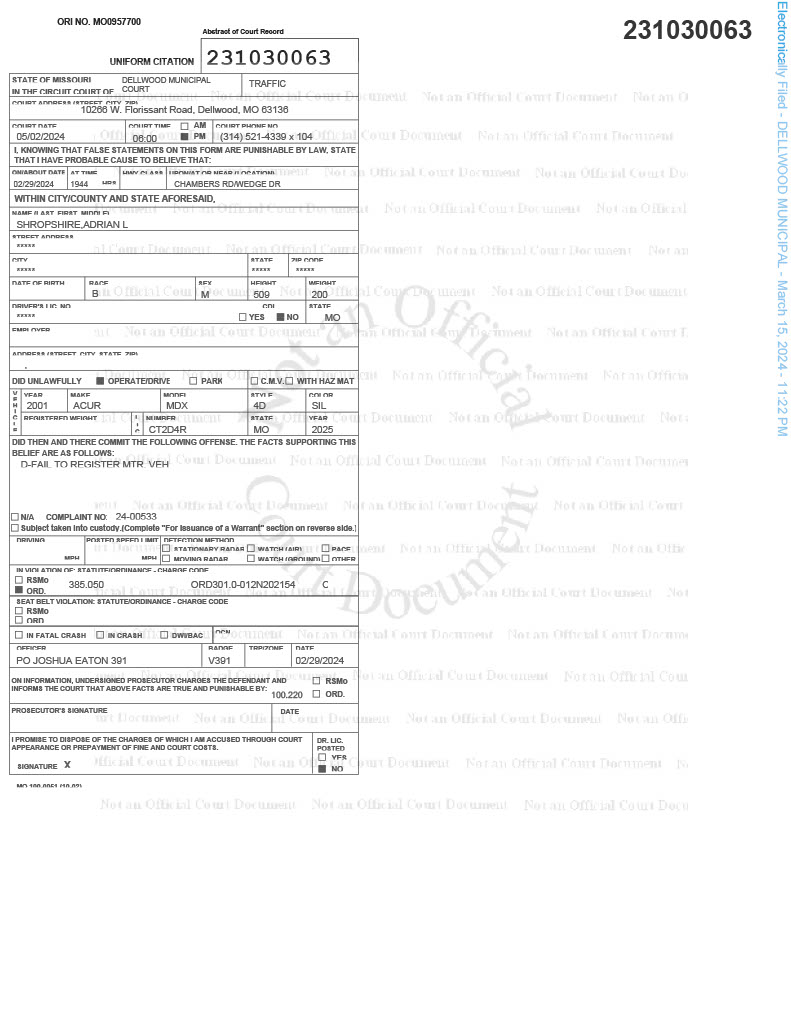 However, there is a clear trail of documentation demonstrating that Shropshire has been driving around for years in a car he owns but never registered properly. On February 29, 2024, Shropshire was stopped by an officer on Chambers near Wedge Dr. and given a citation for an unregistered vehicle, a 2001 Acura. He received a summons to Dellwood Municipal Court and entered a gulity plea.